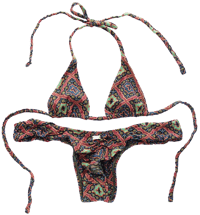 The Beach Booty Bikini Set is a classic triangle top with a matching cheeky-thong bottom. Both pieces are made of four-way stretch soft spandex and lined with elastic banding. The top features openings in each cup for the option of adding your own padding.