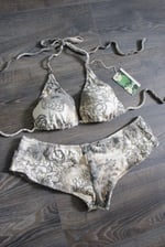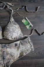 The Blossom Bikini Set is a classic triangle top with a matching boyshort bottom made of two-way stretch reclaimed 100% cotton and lined with elastic banding. Features sequins & openings in each cup for the option of adding your own padding.