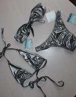 The Chrome Bikini Set can be ordered as a classic triangle top with a matching cheeky tie or boyshort bottom. Both pieces are made of four-way stretch, reclaimed vintage polyester spandex, and lined with elastic banding ♥