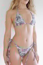 The Dainty Bikini Set is a classic triangle top with a matching cheeky tie up bottom made 100% cotton and lined with elastic banding. Features openings in each cup for the option of adding your own padding.