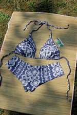 The Daisy Bikini Set is a classic triangle top with a matching cheeky boyshort bottom. Both pieces are made of four-way stretch reclaimed polyester spandex and lined with elastic banding. The top features openings in each cup for the option of adding your own padding.