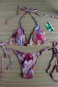 The Distant Lover Bikini Set is a classic triangle top with a matching cheeky tie-up bottom. Both pieces are made of four-way stretch mesh and lined with elastic banding. The top features openings in each cup for the option of adding your own padding.