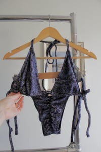 The Diva Bikini Set is a classic triangle top with a matching cheeky tie-up bottom. Both pieces are made of four-way stretch woven glitter mesh and lined with elastic banding. The top features openings in each cup for the option of adding your own padding.