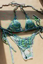 The Fern Bikini Set is a classic triangle top with a matching cheeky tie-up bottom. Both pieces are made of four-way stretch mesh lace and lined with elastic banding. The top features openings in each cup for the option of adding your own padding.