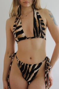 The Flirty Bikini Set is a ready-to-wear classic triangle top with a matching classic tie bikini bottom. The classic tie bottom features a cheeky ruched bum style along with the fuller coverage of a standard bikini bottom.