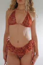 The Foot Of The Mountain Bikini Set can be ordered as a classic triangle top with a matching cheeky tie or boyshort bottom. Both pieces are made of two-way stretch cotton/polyester blend material and lined with elastic banding.♥ Possible style inspo pics included. The material photographs lighter than it is, its a little darker of a burnt orange color.