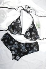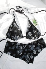 The Forever My Love Bikini Set is a classic triangle top with a matching cheeky boyshort bottom made of four-way stretch slinky stretch polyester/spandex and lined with elastic banding. Features openings in each cup for the option of adding your own padding and adjustable tie straps.