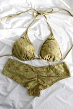 The Fresh Garden Bikini Set is a classic triangle top with a matching cheeky boyshort bottom made of cotton and lined with elastic banding. The layer on the inside of the bottom is a polyester cotton blend, while the gusset lining is made of 100% cotton, like the rest of the bikini. Features openings in each cup for the option of adding your own padding and a translucent mesh bum.