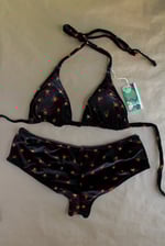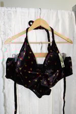 The Fuitful Bikini Set is a classic triangle top with a matching boyshort bottom made of two-way stretch vintage polyester/spandex velvet and lined with elastic banding. Features openings in each cup for the option of adding your own padding and adjustable tie straps.