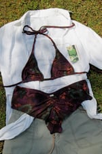 The In The Shade Bikini Set is a classic triangle top with a matching cheeky boyshort bottom. Both pieces are made of four-way stretch reclaimed cotton and lined with elastic banding. The top features openings in each cup for the option of adding your own padding.