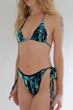 The Lagoon Bikini Set is a classic triangle top with a matching cheeky tie-up bottom. Both pieces are made of four-way stretch reclaimed power mesh and lined with elastic banding. The top features openings in each cup for the option of adding your own padding.