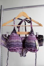 The Lavender Bikini Set is a classic triangle top with a matching cheeky boyshort bottom. Both pieces are made of two-way stretch reclaimed polyester/spandex and lined with elastic banding. The top features openings in each cup for the option of adding your own padding.
