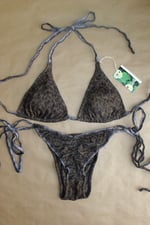 The Leopard Bikini Set is a classic triangle top with a matching cheeky tie-up bottom. Both pieces are made of four-way stretch mesh and lined with elastic banding. The top features openings in each cup for the option of adding your own padding. This set features a see-through mesh bum!