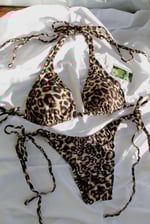 The Leopard Print Bikini Set is a classic triangle top with a matching cheeky tie bottom made of two-way stretch polyester/spandex and lined with elastic banding. The top features double straps and openings in each cup for the option of adding your own padding.