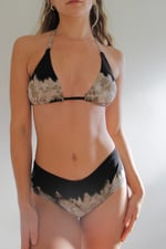 The Like Smoke Bikini Set is a classic triangle top with a matching cheeky boyshort bottom. Both pieces are made of four-way stretch reclaimed polyester/spandex and lined with elastic banding. The top features openings in each cup for the option of adding your own padding.