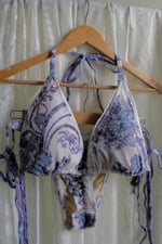 The Lotus Bikini Set is a one-piece bikini set made of two-way stretch vintage polyester/spandex and lined with elastic banding. Features openings in each cup for the option of adding your own padding and adjustable tie straps.