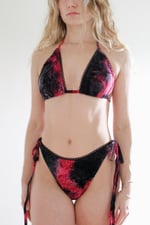 The Lust Bikini Set is a classic triangle top with a matching cheeky tie bottom made of two-way stretch polyester spandex and lined with elastic banding. Features openings in each cup for the option of adding your own padding.