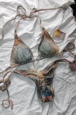 The Occupied Bikini Set is a classic triangle top with a matching cheeky tie bottom made of two-way stretch polyester spandex and lined with elastic banding. Features openings in each cup for the option of adding your own padding.
