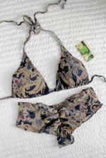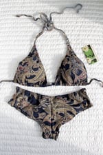 The Parable Bikini Set is a classic triangle top with a matching cheeky boyshort bottom. Both pieces are made of four-way stretch reclaimed mesh and lined with elastic banding. The top features openings in each cup for the option of adding your own padding. The bottom features a translucent mesh bum.
