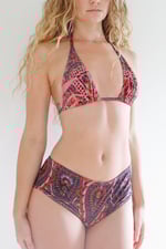 The Pink Burst Bikini Set is a classic triangle top with a matching cheeky boyshort bottom. Both pieces are made of four-way stretch reclaimed polyester spandex and lined with elastic banding. The top features openings in each cup for the option of adding your own padding.