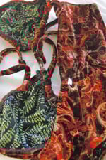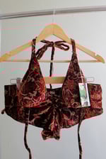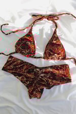 The Red Paisley Velvet Bikini Set is a classic triangle top with a matching boyshort bottom made of two-way stretch polyester/spandex velvet and lined with elastic banding. The top features openings in each cup for the option of adding your own padding.