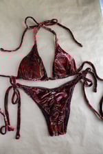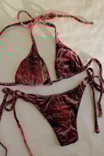 The Ruby Bikini Set is a classic triangle top with a matching cheeky tie-up bottom made of two-way stretch olyester/spandex velvet and lined with elastic banding. Features openings in each cup for the option of adding your own padding.